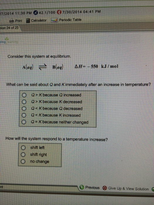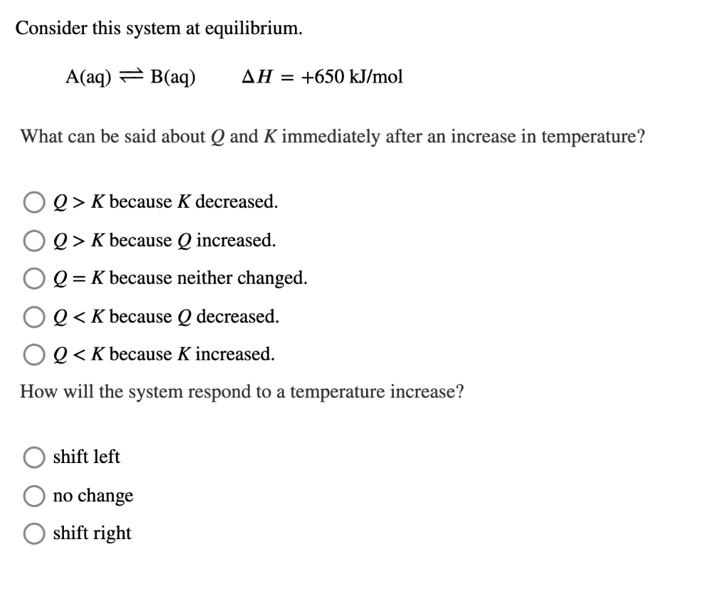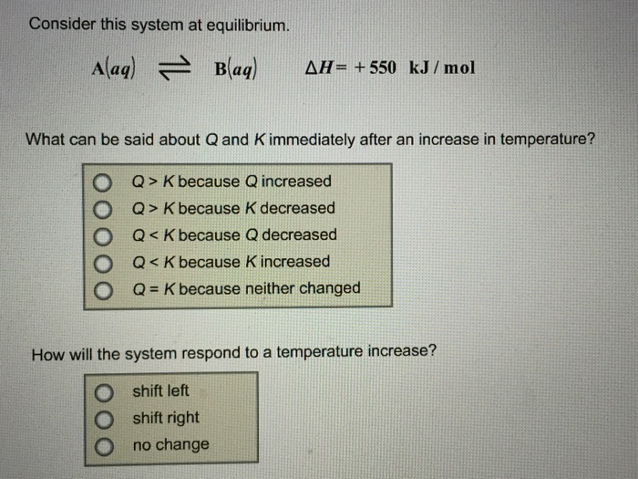 C Q. Consider this system at equilibrium. A aq B aq Δ H 850 kJmol What can be said about Q and K immediately after an increase in temperature.