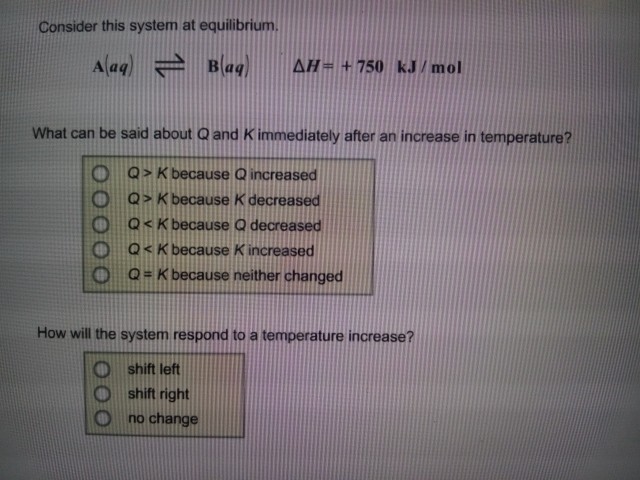 Consider this system at equilibrium. A Q K because Q increased. A aqB aqΔH750 kJmol A aqB aqΔH750 kJmol What can be said about Q and K immediately after an increase in temperature. Consider this system at equilibrium. A aqlt--- gt B aq deltaH-750 kJmol Aaq BaqdeltaH 750kJ mol. 2 question Consider this system at equilibrium. Aaq Baq Delta H 750 kJmol.