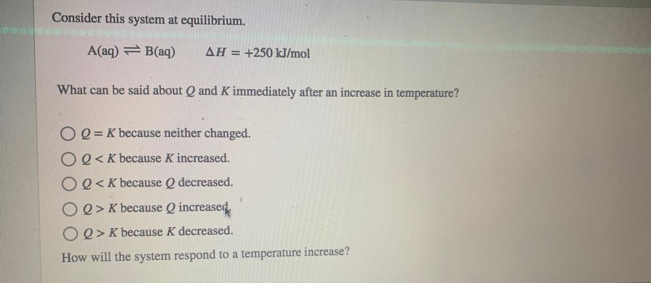 Q K bc K increased. 2 on a question Consider this system at equilibrium. What can be said about Q and K immediately after an increase in temperature.